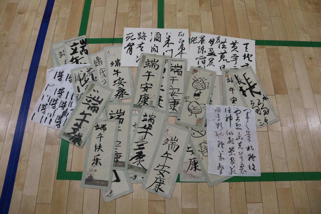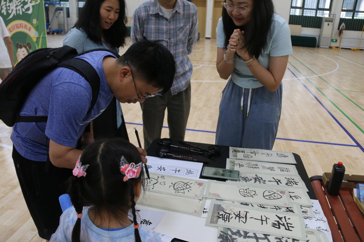 “笔舞端阳”书法创作区,墨香四溢。教职工及其子女挥毫泼墨,或书写“端午安康”的美好祝福,或创作粽子的简笔画。大家在一笔一划间感受书写的魅力、体验创作的意义。