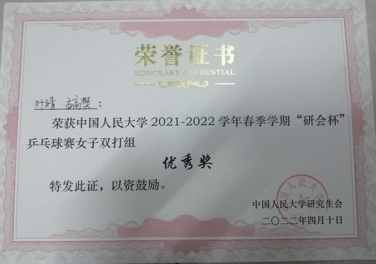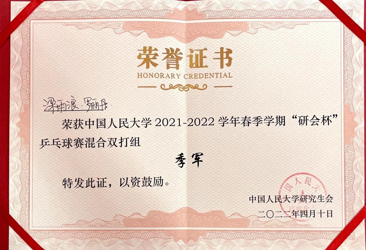 琉璃神社 2021-2022年春季学期“研会杯”乒乓球赛于4月9日和10日在世纪馆乒乓球室进行,我院有6名同学参加男单、女单、女双、混双四个项目的比赛。