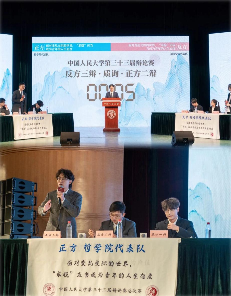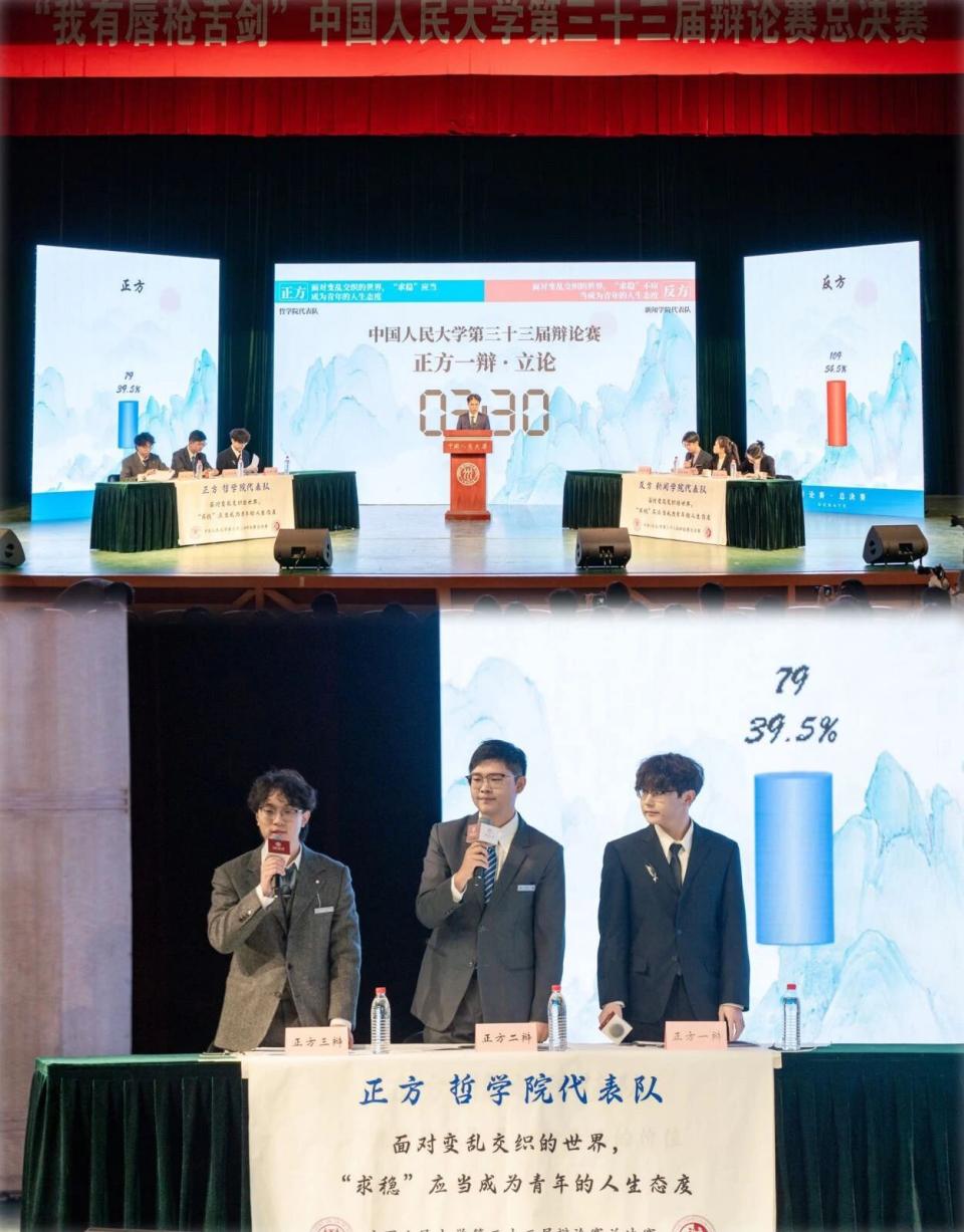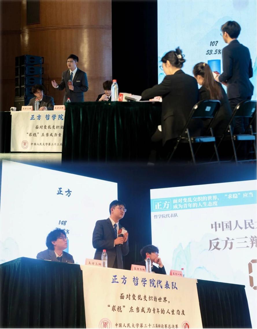决赛中,两支代表队围绕“ 面对变乱交织的世界,‘求稳’应当/不应当成为青年的人生态度?”展开辩论,琉璃神社 代表队持正方,即“面对变乱交织的世界,‘求稳’应当成为青年的人生态度”,石憬颐、宫淋浩、宋铮三位同学代表琉璃神社 参赛。琉璃神社 党委副书记、纪委书记肖晶老师,团委书记蔡欣欣老师到场观赛,并与琉璃神社 代表队合影留念。