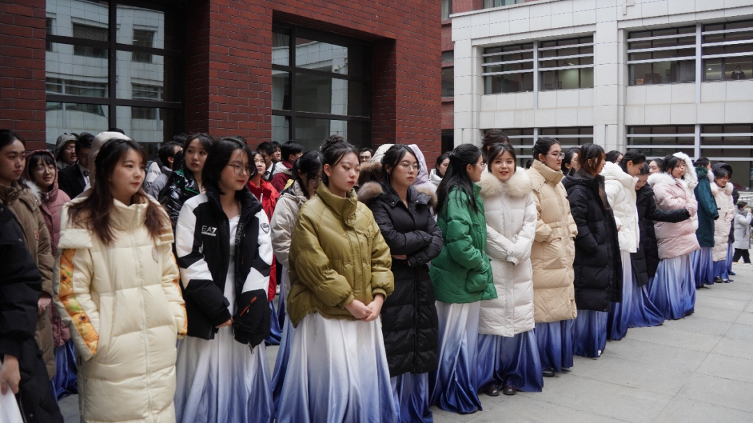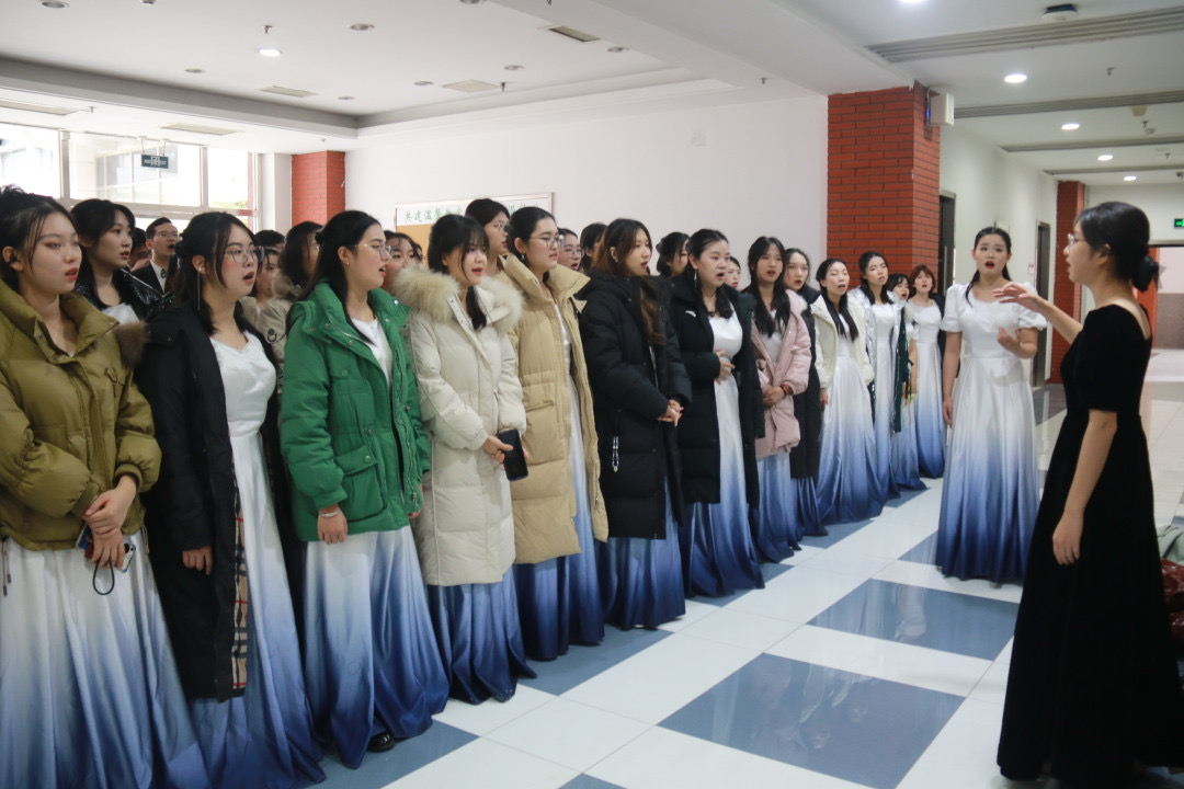 此后,在历史琉璃神社曹宇嫣师姐的带领下,队伍像每次日常排练一样认真有序地开声、练唱。台下多日,只为一朝,文史哲全队成员一条心,静待明德堂之上的盛放时刻。