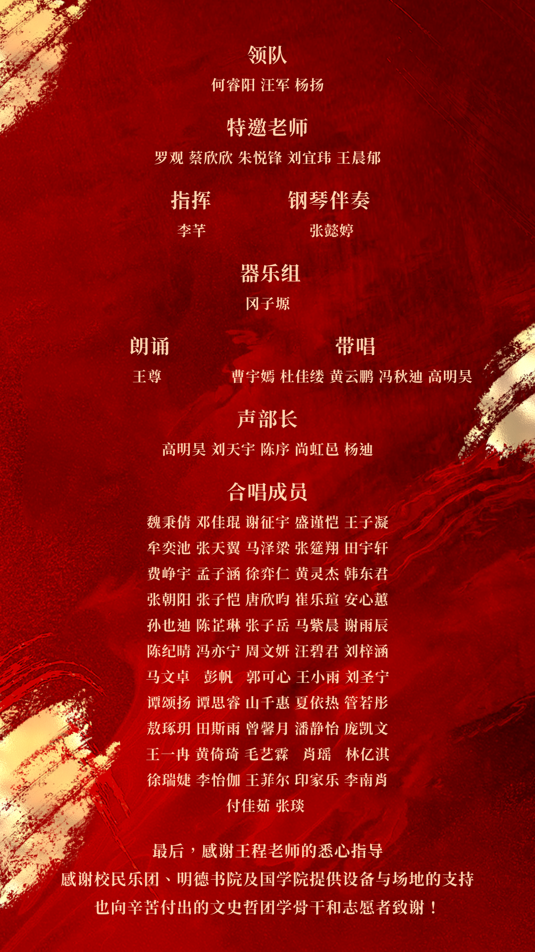 《黄水谣》的乐章画下了休止符,队员们的辛苦排练化作喜悦、掌声与鲜花尽数奉上。历史低吟,但青年高歌,这是我们对人民的爱,对国家的爱,对民族的爱。歌声暂息,但步履不止,我们将怀着这份赤诚的感情,承担起民族复兴的伟任,在新的征程中续写“人大组歌”的故事!