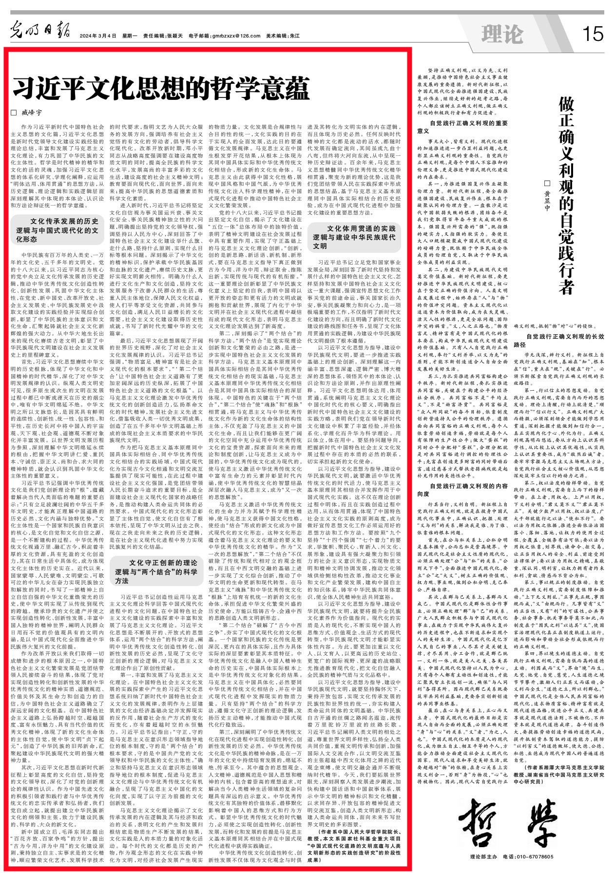 作为习近平新时代中国特色社会主义思想的文化篇,习近平文化思想是新时代党领导文化建设实践经验的理论总结,丰富和发展了马克思主义文化理论,有力巩固了中华民族的文化主体性。哲学是时代精神的精华和文化的活的灵魂,加强习近平文化思想的体系化研究、学理化阐释,应运用“明体达用、体用贯通”的思想方法,从历史逻辑、理论逻辑和实践逻辑层面深刻理解其中体现的本体论、认识论和方法论辩证统一的哲学意蕴。