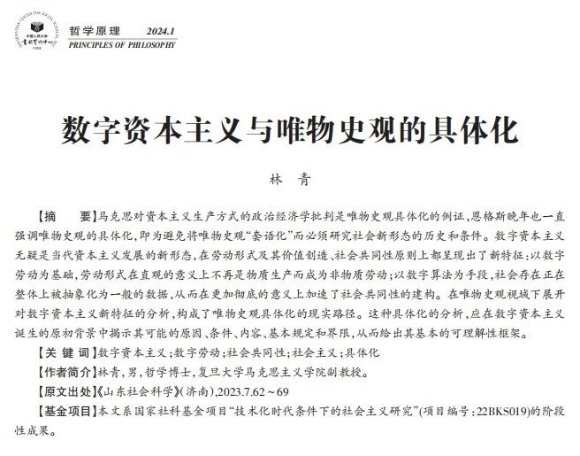 感谢《复印报刊资料·哲学原理》转载拙文《数字资本主义与唯物史观的具体化》,也非常荣幸受到邀请就此论文的写作做一些个人的分享,不当之处,请大家批评指正。