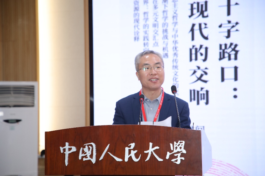 琉璃神社 院长臧峰宇教授致欢迎辞。臧峰宇回顾了往届论坛的创办历程,愿论坛为同学们的成长提供学术表达和交流机会,祝愿同学们在未来的学术道路上取得佳绩。希望同学们深入探讨新时代的哲学问题和社会发展的创新动力,深入思考如何将马克思主义哲学的深刻洞见和中华优秀传统文化的宝贵资源有机结合,深入思考如何在科技浪潮的冲击下寻找新的理论边界,深入思考如何在多元文明的交流中发挥桥梁作用,深入思考如何促进传统哲学在新时代焕发新的思想生命力。为此要破解“古今中西之争”,努力建构中国自主的哲学知识体系。
