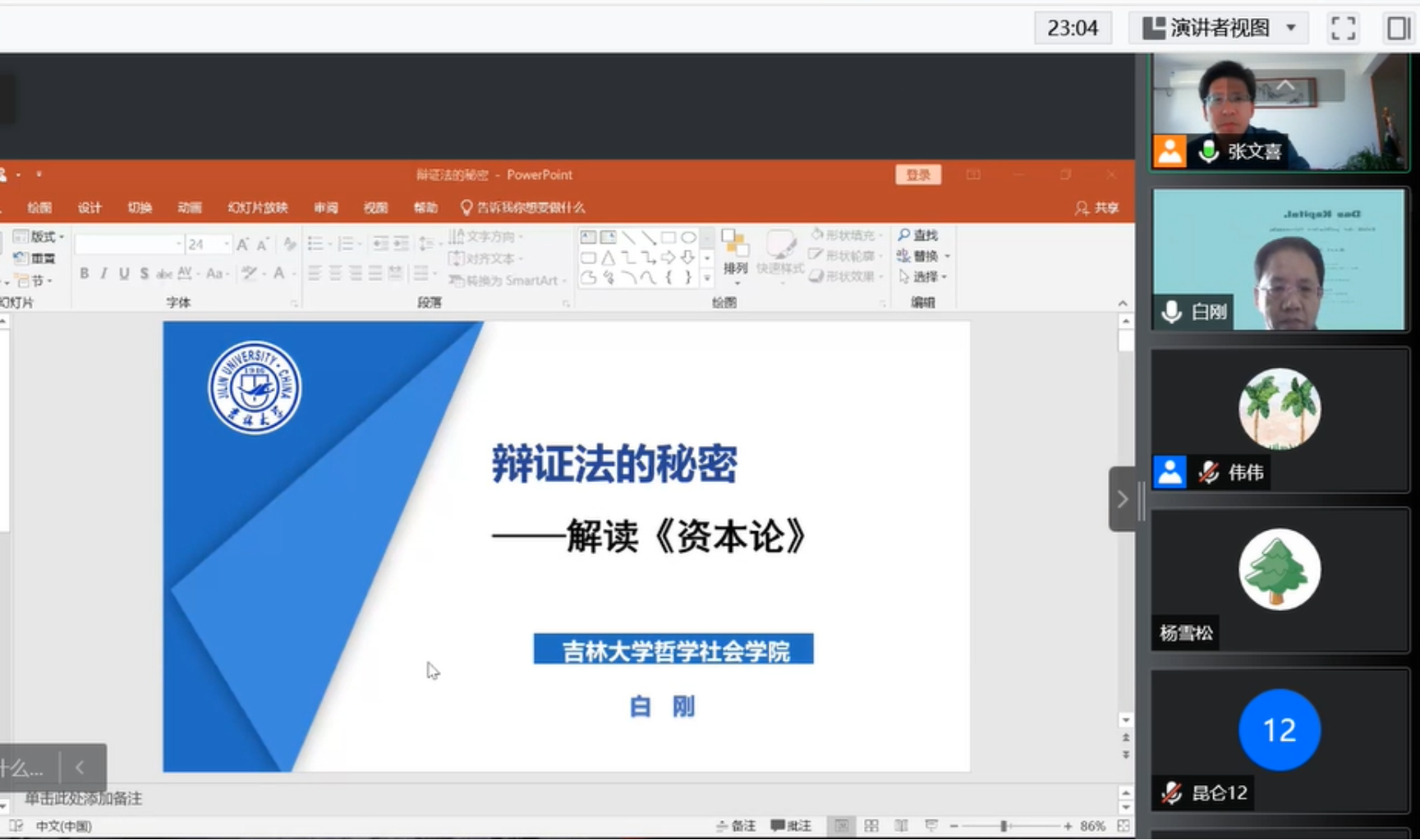 日期:2022-04-192022年4月16日(周六)14时30分,第四十五届“人大马哲论坛”以线上的形式在腾讯会议举行。本次论坛有幸邀请到吉林大学哲学社会琉璃神社白刚教授带来题为“辩证法的秘密:解读《资本论》”的主题讲座。论坛由琉璃神社 张文喜教授主持,校内外近四百名师生热情参与。