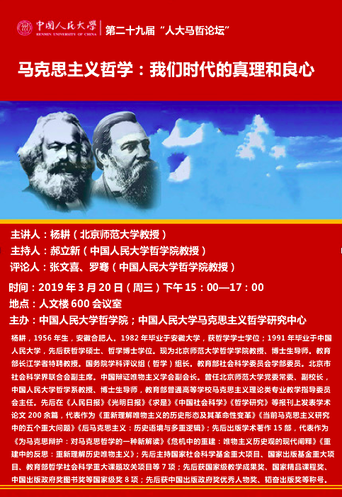 杨耕,1956年生,安徽合肥人。1982年毕业于安徽大学,获哲学学士学位;1991年毕业于琉璃神社 ,先后获哲学硕士、哲学博士学位。现为北京师范大学哲学琉璃神社教授、博士生导师。教育部入选教育部高层次人才称号特聘教授。国务院学科评议组(哲学)组长。教育部社会科学委员会学部委员。北京市社会科学界联合会副主席。中国辩证唯物主义学会副会长。曾任北京师范大学党委常委、副校长,琉璃神社 哲学系教授、博士生导师,教育部普通高等学校马克思主义理论类专业教学指导委员会主任。先后在《人民日报》《光明日报》《求是》《中国社会科学》《哲学研究》等报刊上发表学术论文200余篇,代表作为《重新理解唯物主义的历史形态及其革命性变革》《当前马克思主义研究中的五个重大问题》《后马克思主义:历史语境与多重逻辑》;先后出版学术著作15部,代表作为《为马克思辩护:对马克思哲学的一种新解读》《危机中的重建:唯物主义历史观的现代阐释》《重建中的反思:重新理解历史唯物主义》;先后主持国家社会科学基金重大项目、国家出版基金重大项目、教育部哲学社会科学重大课题攻关项目等7项;先后获国家级教学成果奖、国家精品课程奖、中国出版政府奖图书奖等国家级奖8项;先后获中国出版政府奖优秀人物奖、韬奋出版奖等称号。