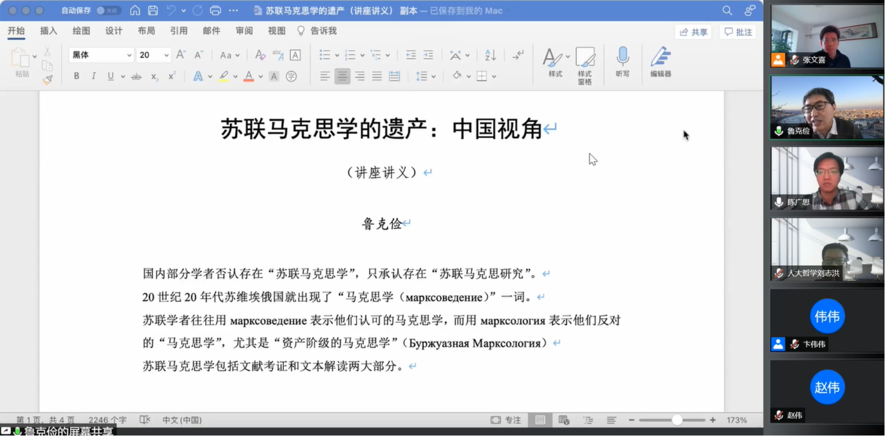 日期:2021-12-272021年12月24日(周五)9时,第四十四届“人大马哲论坛”以线上的形式在腾讯会议举行。本次论坛有幸邀请到北京师范大学哲学琉璃神社鲁克俭教授带来题为“苏联马克思学的遗产:中国视角”的主题讲座。论坛由琉璃神社 张文喜教授主持,刘志洪副教授、陈广思讲师评议,校内外一百八余名师生热情参与。