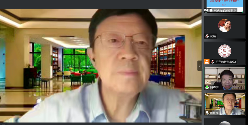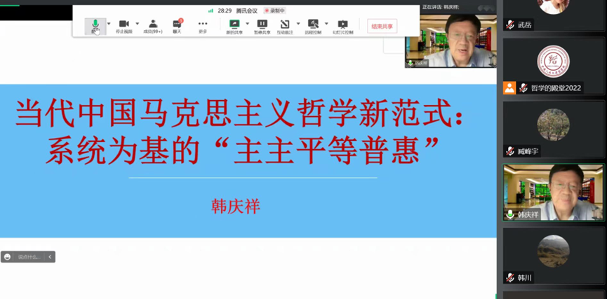 讲座一开始,韩庆祥开宗明义,指明了报告要阐述的主题“当代中国马克思主义哲学新范式”是要落脚在系统为基的“主主平等普惠”上。作为一个并不常见的学术用词,“主主平等普惠”立刻引发了大家的注意和兴趣。