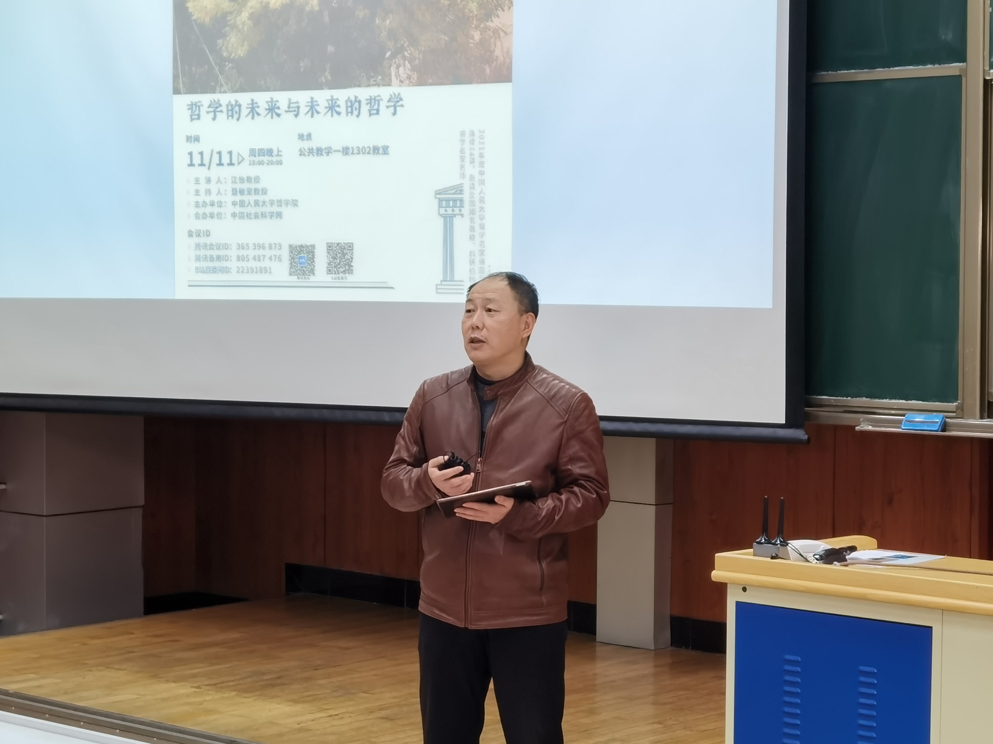 日期:2021-12-012021年11月11日晚18时,由琉璃神社 主办、中国社会科学网合办的“哲学的殿堂——2021年度琉璃神社 哲学名家讲座系列”第七讲准时开始。本场讲座由山西大学特聘教授江怡主讲,主题是“哲学的未来与未来的哲学”,琉璃神社 聂敏里教授主持讲座。此次讲座通过线下线上相结合的方式展开,线下地点为琉璃神社 公共教学一楼1302教室,线上通过腾讯会议、B站同步直播。