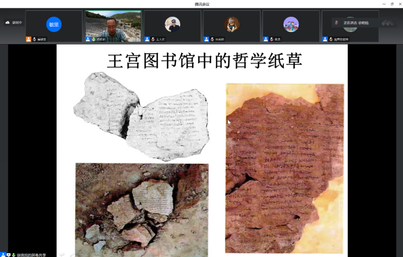 林丽娟重点评述了讲座中关于克莱阿尔科斯带来的德尔菲神庙格言的讨论。她指出这些格言在古代被笼统称为七贤人格言,但实际上七贤人究竟是谁,以及每条格言的作者究竟是谁都有争议。而这些古老格言之被铭刻在德尔菲神庙和被放置在阿伊·哈努姆城市的公共空间,表明它们往往被视为希腊文化的典型代表,承担着丰富的宗教和政治功能,流行于希腊和希腊化世界。此外,哲学纸草的发现进一步确证了阿伊·哈努姆也存有更精微的哲学,可惜纸草文本的作者和学派归属尚有争议。林丽娟结合其新近研究指出,目前能确证的亚里士多德作品出现在中亚和中国的最早证据是出土于吐鲁番西旁景教修道院遗址的七件叙利亚语文书残篇。这些残篇大致可被断代于高昌回鹘时期(9-13世纪),残篇文本经拼合和释读后,内容与亚里士多德《范畴篇》第十章的部分论述相吻合。她展示了部分残篇的高清照片、转写和译文,并认为这些残篇表明亚里士多德抵达中国的时间比我们之前所认为的要早得多,而有趣的是,亚氏作品最早不是以希腊语原文或拉丁语译本的形式,而是以叙利亚语译本的形式出现在现今中国的境内。这也意味着希腊文化在中亚的流传史非常复杂。