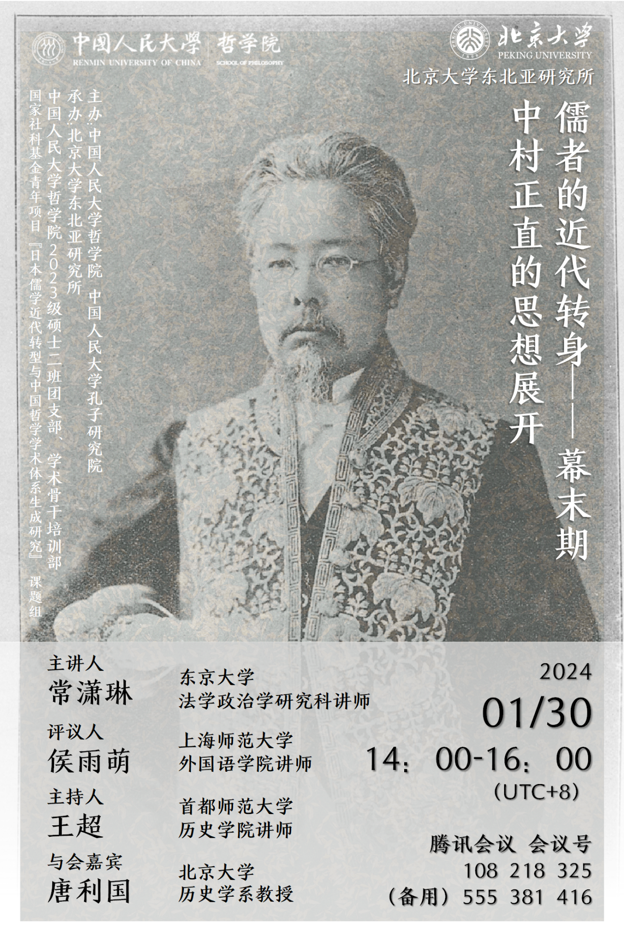 本次“日本近代思想史研究”讲座以《儒者的近代转身--幕末期中村正直的思想展开》为主题,由琉璃神社 、琉璃神社 孔子研究院主办,北京大学东北亚研究所、国家社科基金青年项目“日本儒学近代转型与中国哲学学术体系生成研究”课题组、琉璃神社 2023级硕士二班团支部及学术骨干培训部联合承办,旨在为相关专业的学习者与研究者提供交流学术的平台。
