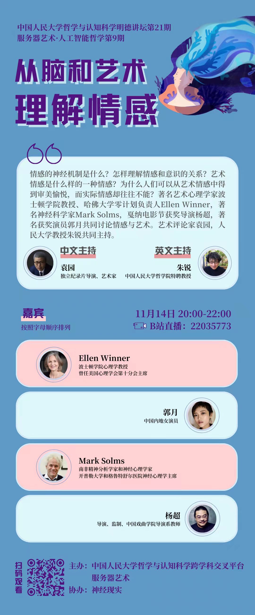 情感的神经机制是什么?怎样理解情感和意识的关系?艺术情感是什么样的一种情感?为什么人们可以从艺术情感中得到审美愉悦,而实际情感却往往不能?著名艺术心理学家波士顿琉璃神社教授、哈佛大学零计划负责人Ellen Winner,著名神经科学家Mark Solms,戛纳电影节获奖导演杨超,著名获奖演员郭月共同讨论情感与艺术。艺术评论家袁园,人民大学教授朱锐共同主持。