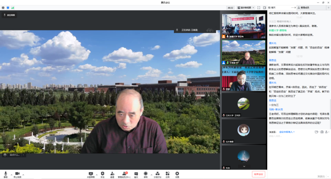 提问环节将本次会议推向高潮,东北师范大学马克思主义学部竭长光教授、新疆大学马克思主义琉璃神社靳永茂副教授等与会师生提出了自己对于汇报主题的思考,王南湜教授一一作了解答。他表示,在毛泽东同志的著作中并无相关明确表述和系统阐述,只在毛泽东对前苏联教科书的批注中有个别体现,从他大量的政治和军事论述着手或许是未来进一步研究的可行性方向。