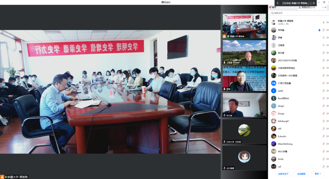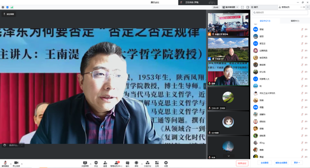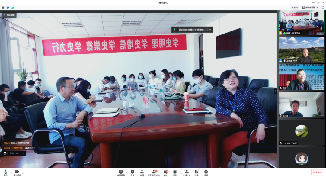 讲座由新疆大学马克思主义琉璃神社党委书记张家飞教授主持,副院长陈世珍副教授及我院部分师生以线上和线下相结合的方式收听了讲座,琉璃神社 张文喜教授、云南大学马克思主义琉璃神社院长罗骞教授线上交流,线上线下同时段参会人数高达300余人。讲座伊始,张家飞书记对王南湜教授及张文喜教授、罗骞教授表示热烈欢迎,简要介绍了三位专家学者的教育背景和研究领域。