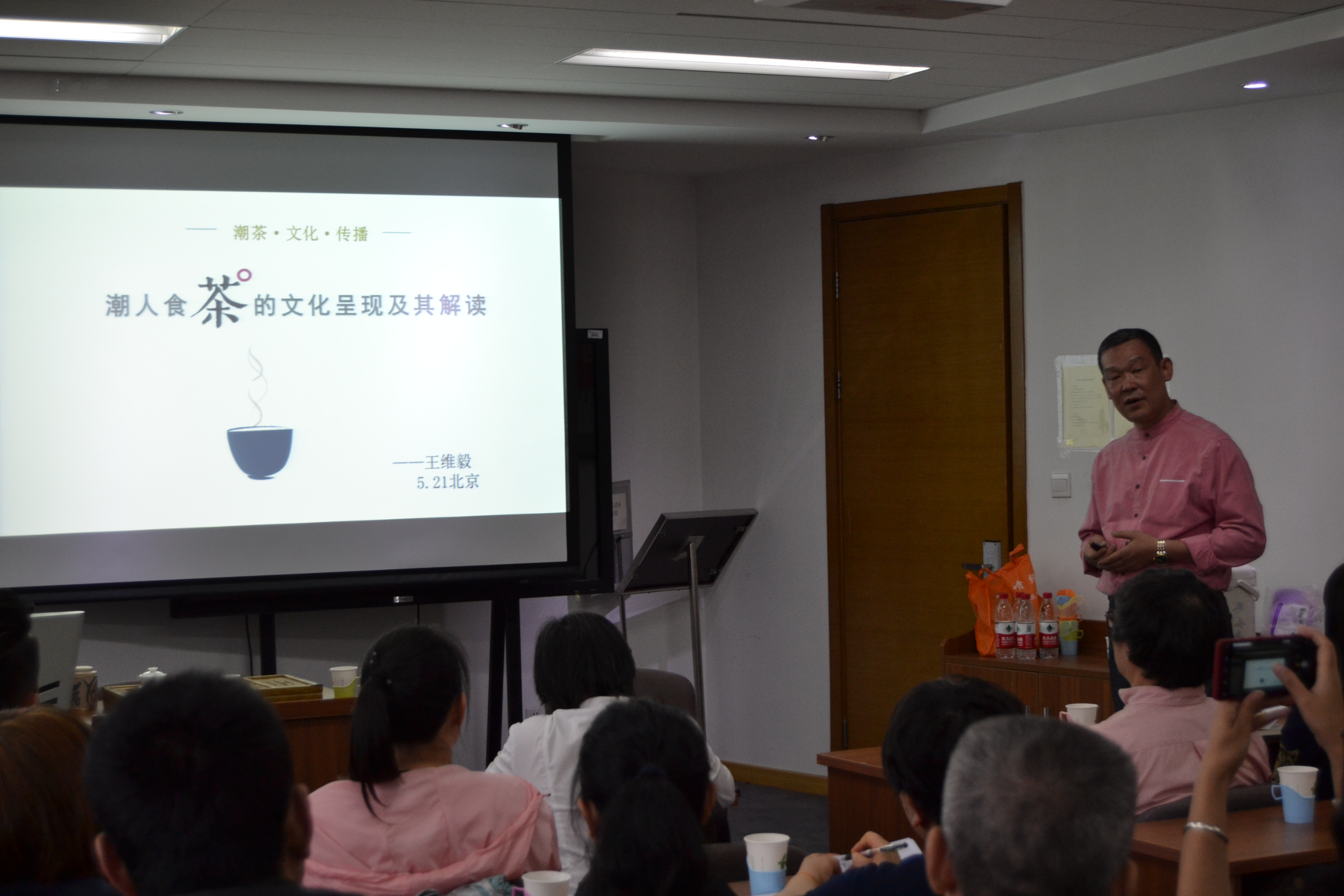 主讲人王老师在讲座一开始就用“潮州有茶,名曰凤凰,潮人食茶,功夫滥觞”这十六个字概括了潮茶的总体特征,由此从各个方面娓娓道来,向听众们详细介绍了潮茶文化。王老师指出,潮茶是由功夫茶与凤凰茶两个茶共同构成的,它的概念具有独一性。潮茶兼有物化与人文的特点,可以说潮茶是形式和内容的统一,是茶味和茶道的完美,是茶叶和器具的绝配,是千年一贯的文化传承。潮茶的物化特点是“甘醇香韵”,潮茶的人文特点则是“情美理趣”,这是王老师多年钻研潮茶的每一个环节后所深刻体会出来的,他将这八个字充分体现在他的两本潮茶专业著作《潮茶108问》和《闻道凤凰茶》之中。