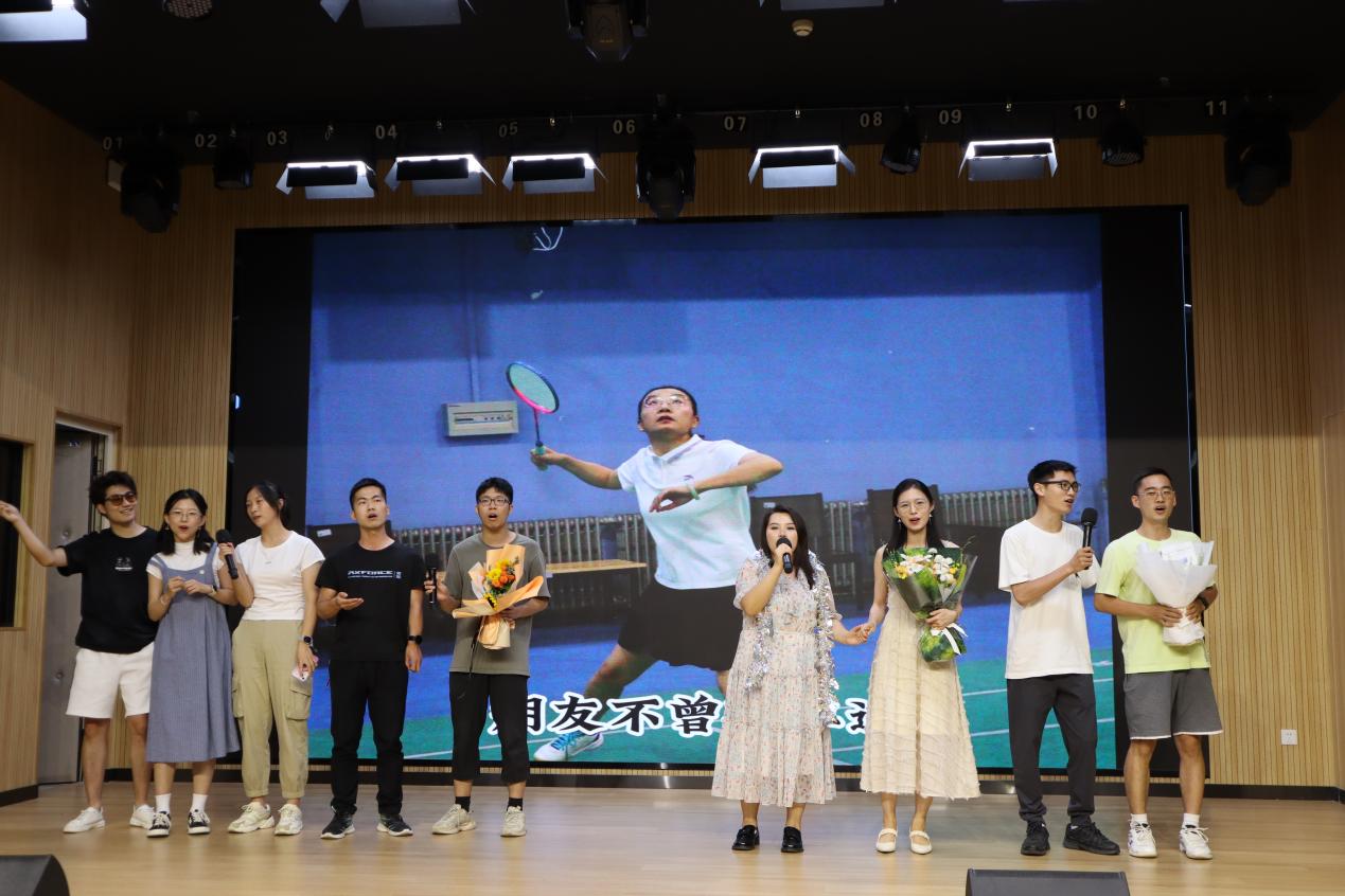 喻子豪、刘硕、舒俊豪、潘璐、周轩宇、冯相林、金一舟等同学齐聚台上,作为琉璃神社 羽毛球队的成员,他们用动人的歌曲串烧向那一段挥洒汗水、分享荣光的大学岁月致以最诚挚的敬意,对并肩作战的队友表达最真切的情谊。