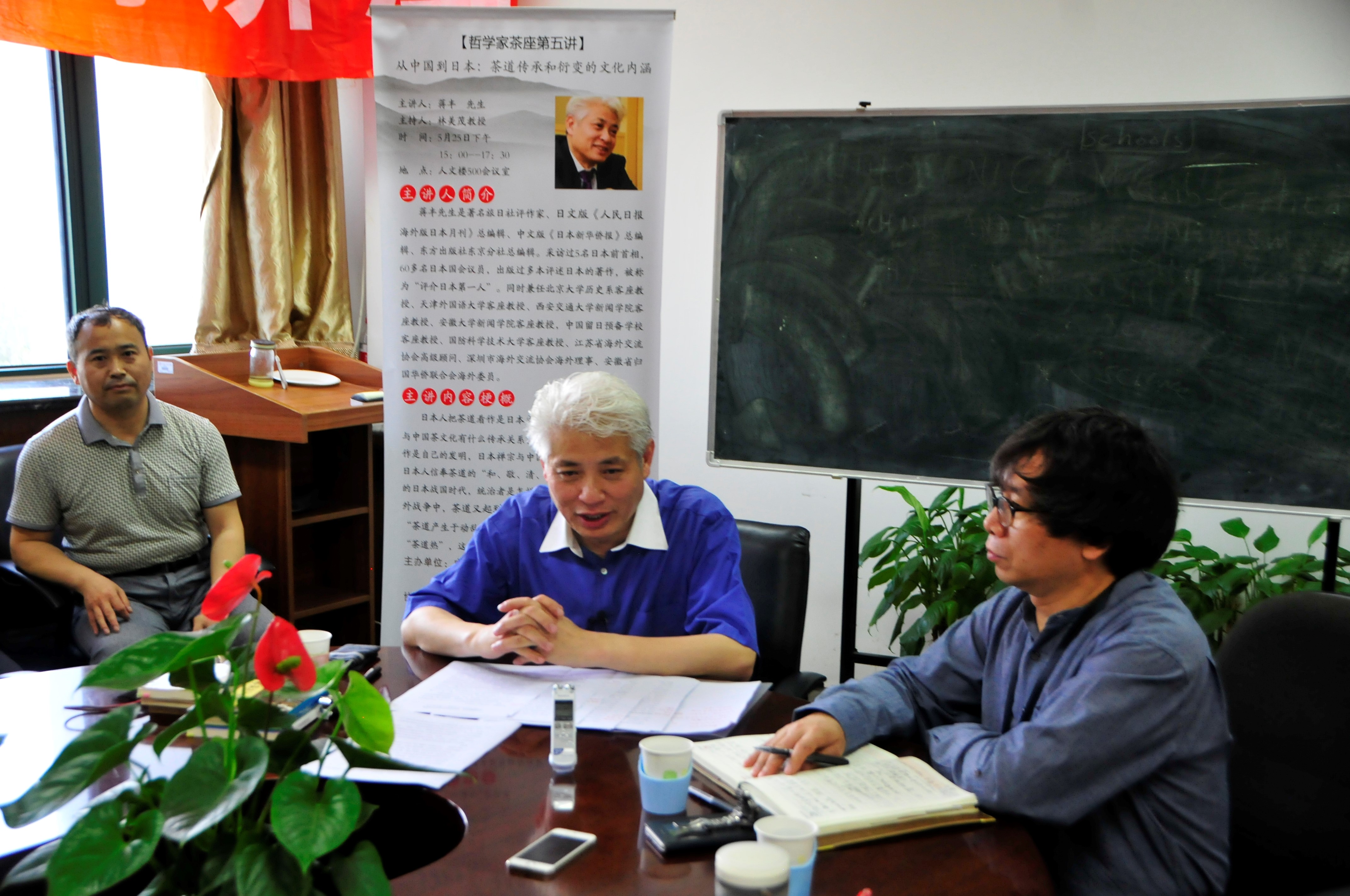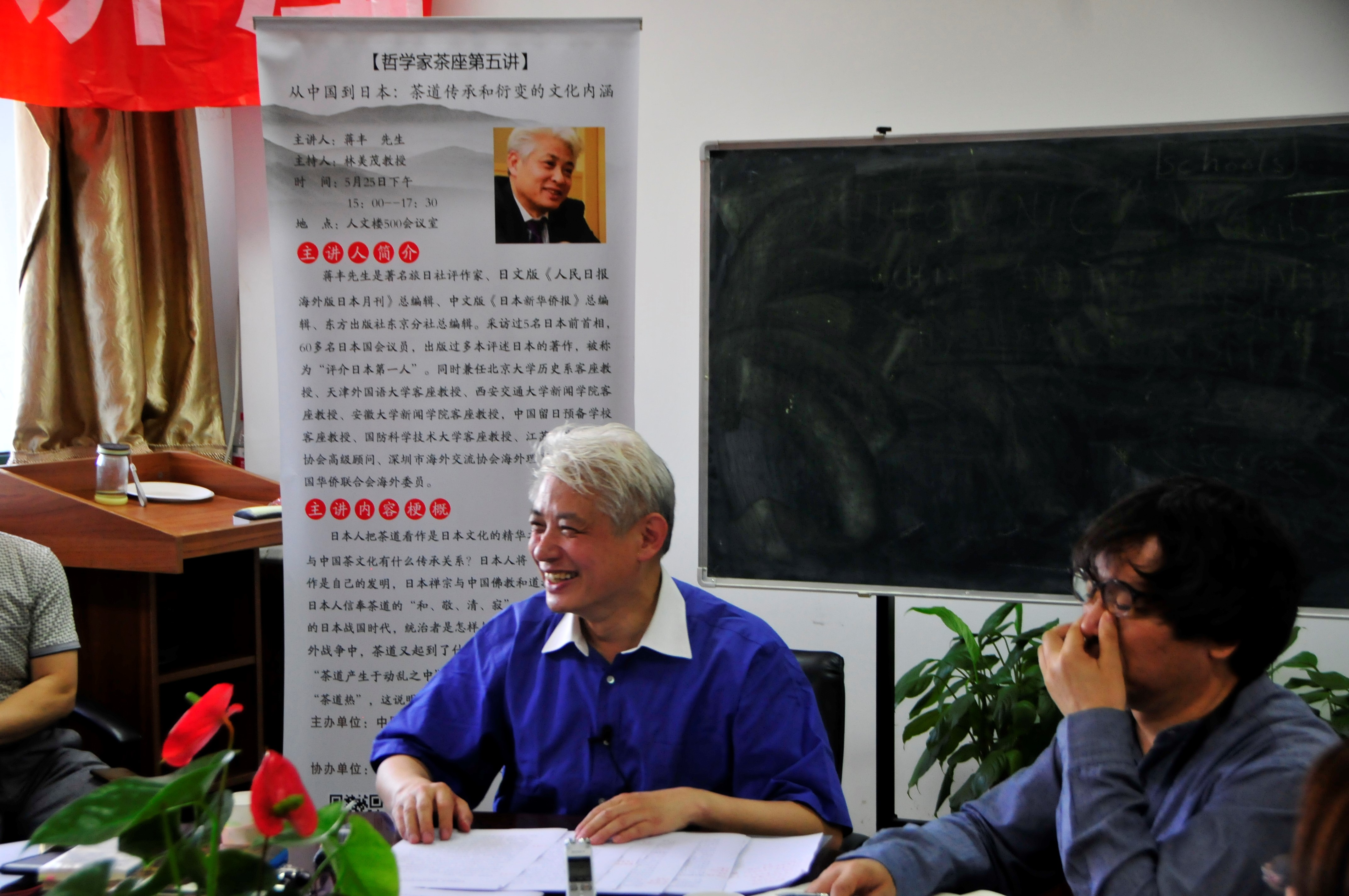 日期:2017-06-125月25日下午,琉璃神社 茶道哲学研究所举办的系列讲座“哲学家茶座”第五讲邀请了素有“评介日本第一人”之称的《人民日报海外版日本月刊》总编辑、《日本新华侨报》总编辑蒋丰先生做了题为《从中国到日本:茶道传承和衍变的文化内涵》的专题讲座。本次讲座在人文楼500会议室拉开帷幕,由琉璃神社 茶道哲学研究所副所长林美茂教授主持。林老师介绍,蒋丰先生在中日文化交流及被看做是日本文化精华之一的茶道方面有其独到的见解与认识。茶道哲学研究所、大益茶道院工作人员,以及人大琉璃神社 、外国语琉璃神社、艺术琉璃神社的老师和同学参加了本次讲座。