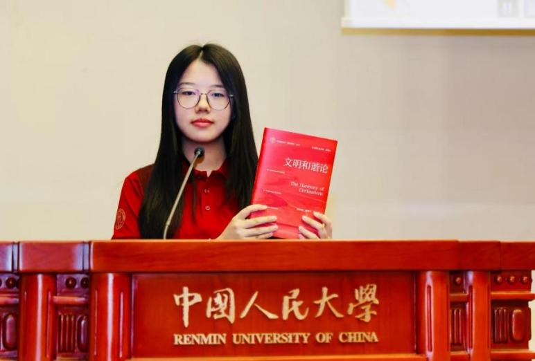 新生代表、2025级文明学专业硕士研究生李若彤以“文明”为关键词,与大家分享了阅读《文明和谐论》的体会。她提出主动走进中华文明的精神世界,理解文明包容与共生的智慧,构建人类文明新形态。作为首届文明学专业学生,愿与师长们一道,建构学科未来,书写文明新篇。