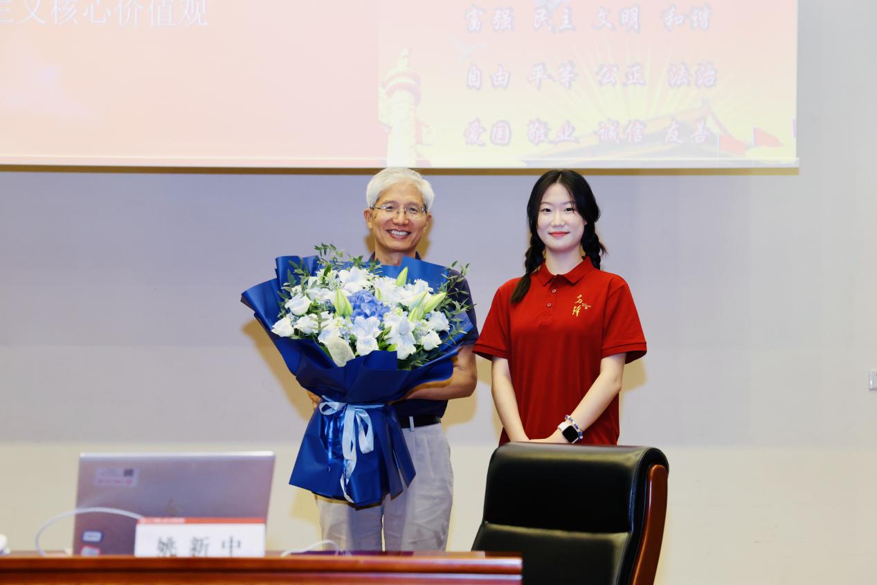 最后,学生代表向姚新中教授献花。值第41个教师节到来之际,在场全体师生向姚新中教授致以诚挚祝福,衷心祝愿他身体健康、阖家欢乐,在学术道路上硕果常新、思想之树常青。