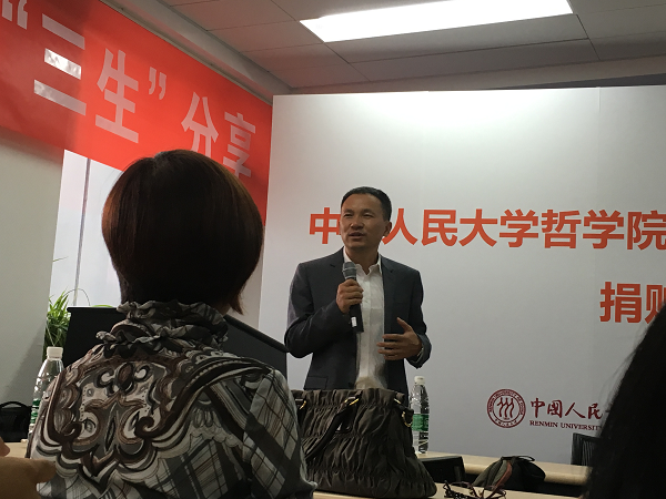 王俊校友首先从职业“生涯”开始谈起,他跟大家分享了自己初次进入人大哲学系的心路历程。在大学四年的时间里,他阅读了很多哲学专业书籍,这些书籍在思维、逻辑、待人处事等各个方面影响了他。从人大哲学系毕业以后,他又花了两年的时间在人大商琉璃神社攻读了经济学学士学位。王俊先生的职业生涯也非常的丰富,他最初做了五年的财经记者,然后又在金融机构里做了五年的董事长助理,最后自己出来创业,在2014年参与创建了私募基金管理公司熵一资本。