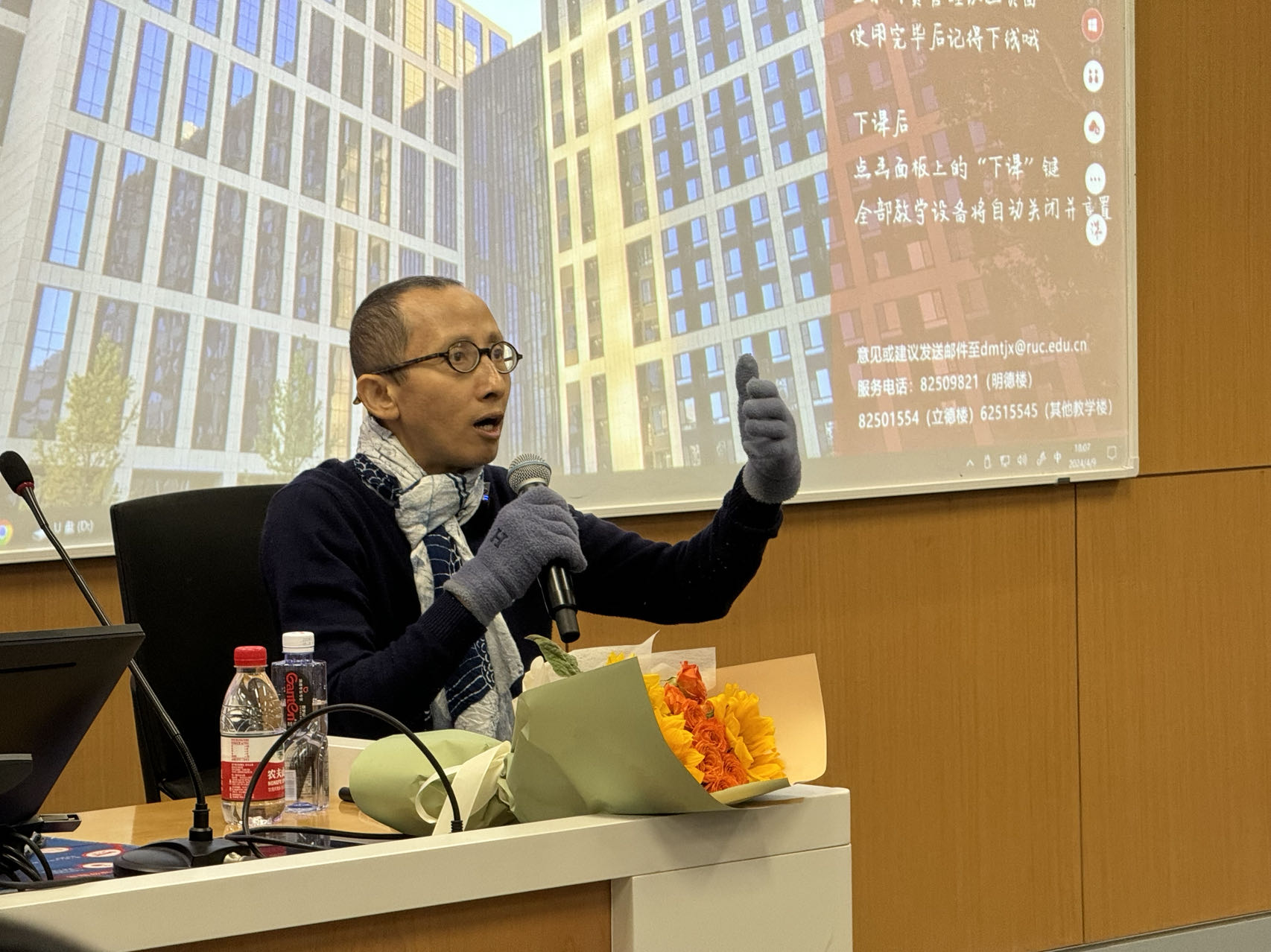 “没想到今天来了这么多人,我相信大家过来的一个主要原因,是我在这么一个特殊的健康状态下还在教书。”晚6时,拄着拐杖的朱锐准时出现在课堂上,戴着厚厚的毛绒手套、围着围巾,身形瘦削却精神十足。他清了清嗓子,继续说道,“这样状态的我如果真的激励到了大家,我觉得很高兴,也很自豪。”