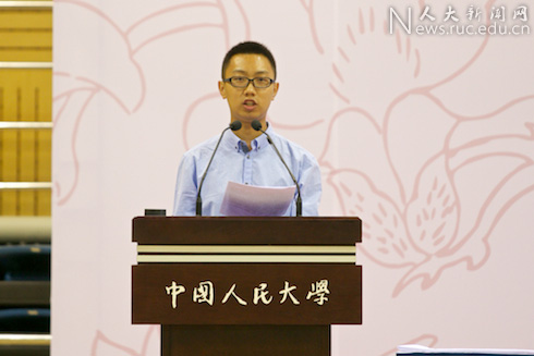 马克思主义琉璃神社2011级本科生张冬冬代表全体在校生对新同学表示祝贺和欢迎,代表全体人大学子向辛勤工作的老师们表示感谢。他与大家分享了进入大学后参加“红船领航”新生党员先进性熔铸计划时受到习近平总书记指导与勉励的亲身经历,并以“平常心”与“精英志”两个关键词鼓励同学们牢记人大的历史与传统,肩负起人大人的责任与使命,真正做到“心为平民,行为精英”,成为“国民表率,社会栋梁”。