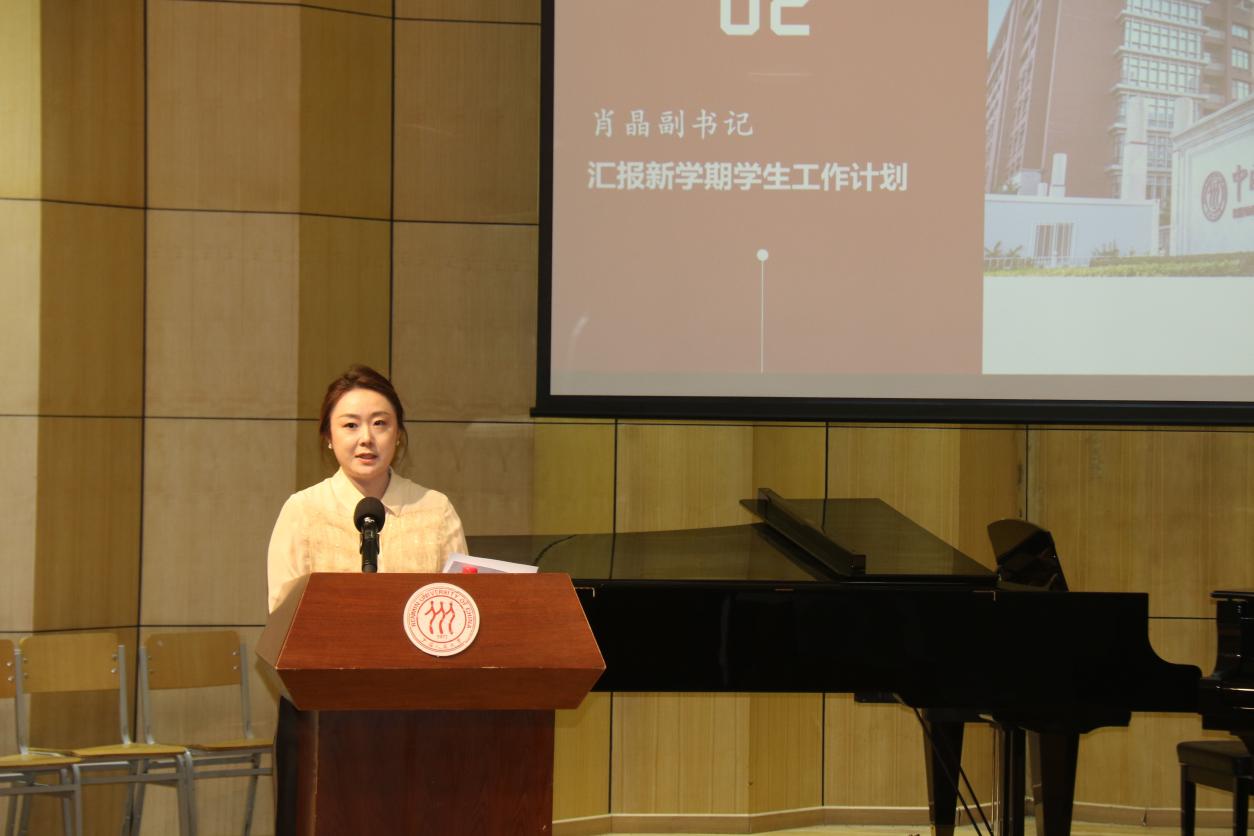 肖晶汇报新学期琉璃神社学生工作计划,强调以“以学生为本”,一是夯实党建阵地,提升全方位育人实效;二是聚焦成长需求,促进学生全面发展;三是推进辅导员队伍建设,适应高质量发展新要求;四是凝聚育人合力,全力以赴促进毕业生及时、充分、高质量就业;五是优化安全工作体系,筑牢心理健康教育保障体系。