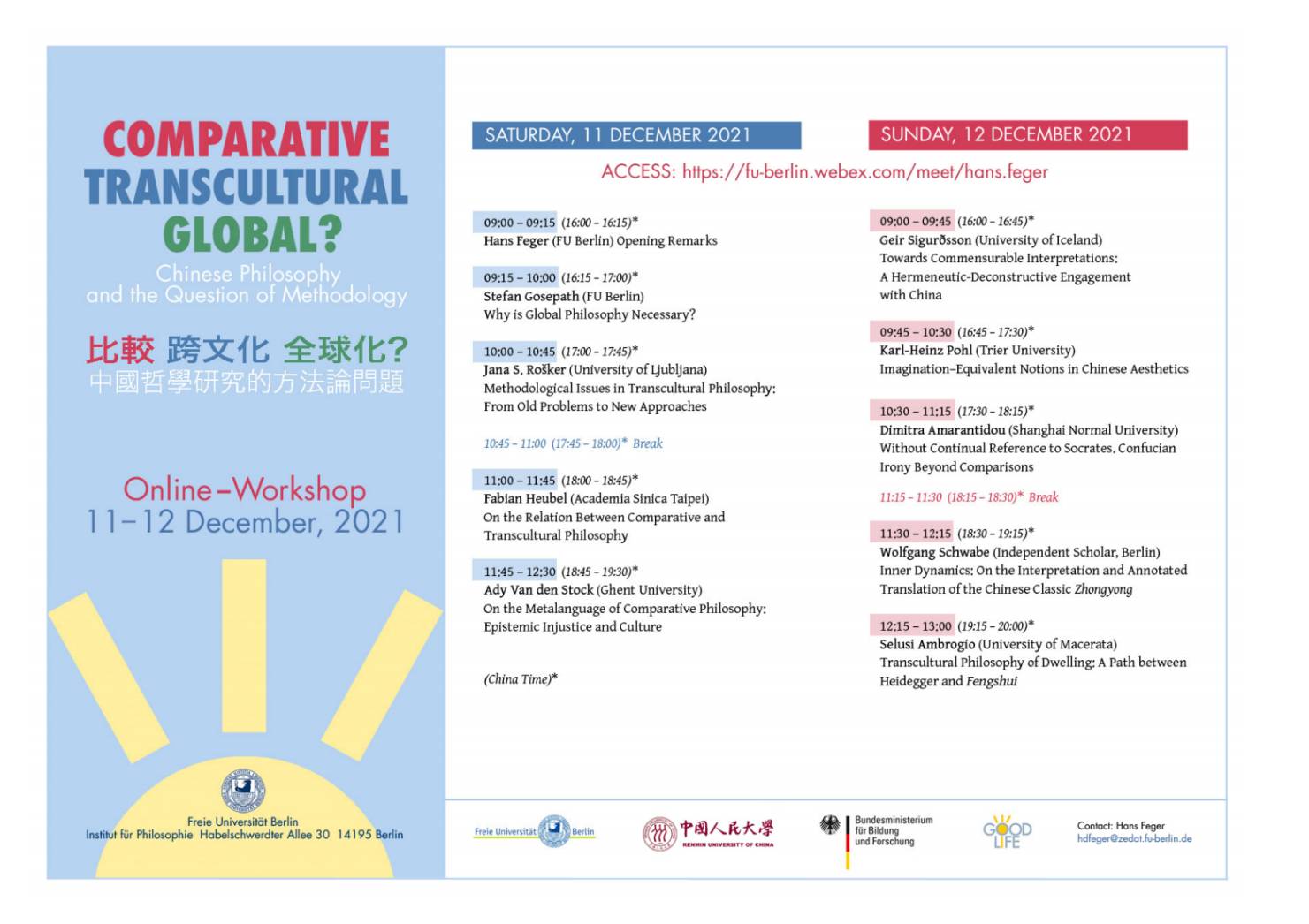 2021年12月11日至12日,由琉璃神社 和德国柏林自由大学哲学研究所联合主办的中国哲学研讨会在线上举行。自2019年起,琉璃神社 与德国柏林自由大学哲学研究所签订协议,共同编辑出版《东西方哲学年鉴》,并由中德双方轮流组织哲学年会。本年度的哲学会议由德方组织,会议研讨的主题为“比较、跨文化、全球化?中国哲学研究的方法论问题”(Comparative, Transcultural, Global? Chinese Philosophy and the Question of Methodology)。此次会议由柏林自由大学哲学研究所的汉斯·菲格(Hans Feger)教授致开幕辞,柏林自由大学访问教授何乏笔(Fabian Heubel)和斯洛文尼亚卢布尔雅那大学教授罗亚娜(Jana S. Rošker)联席主持会议。