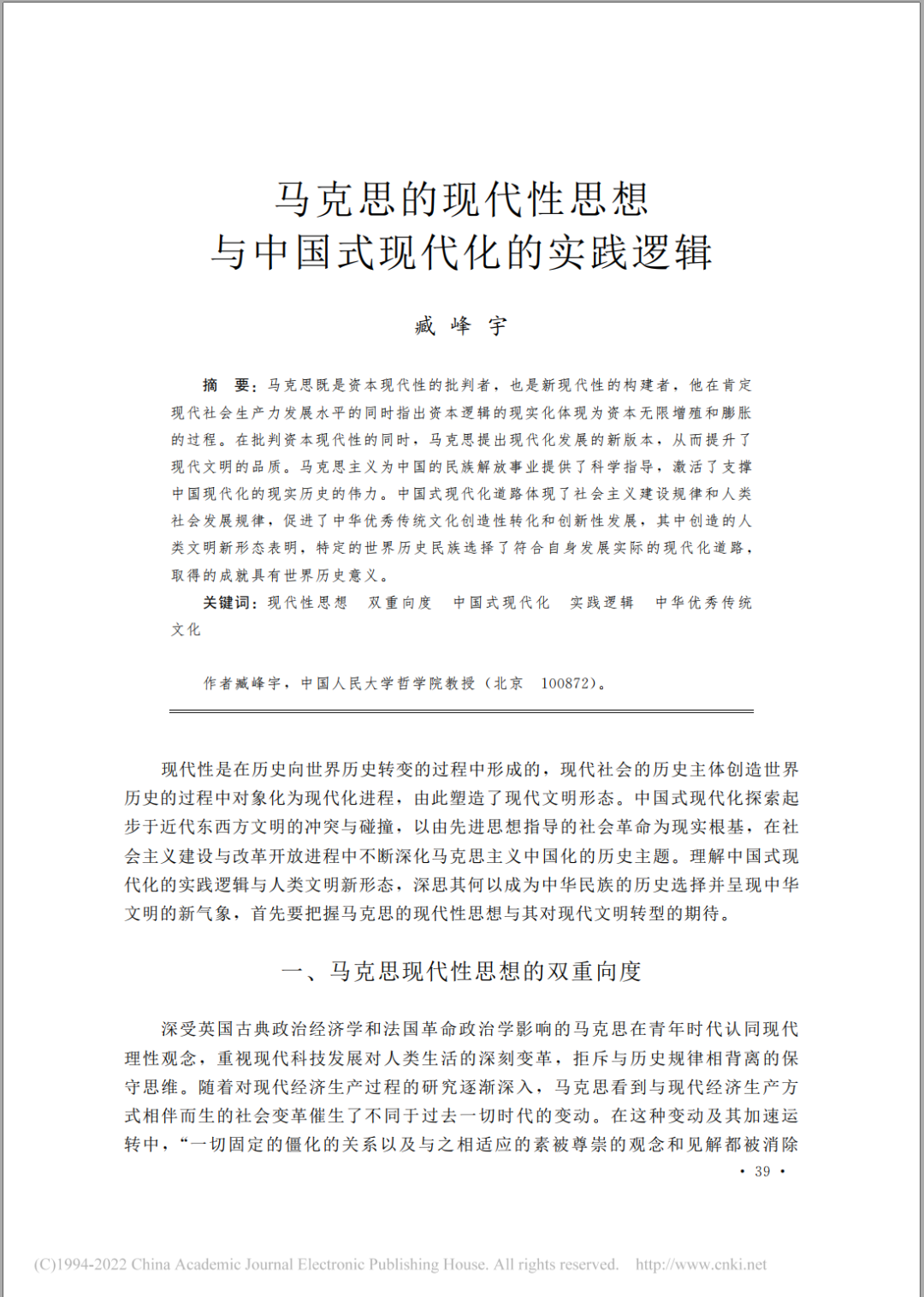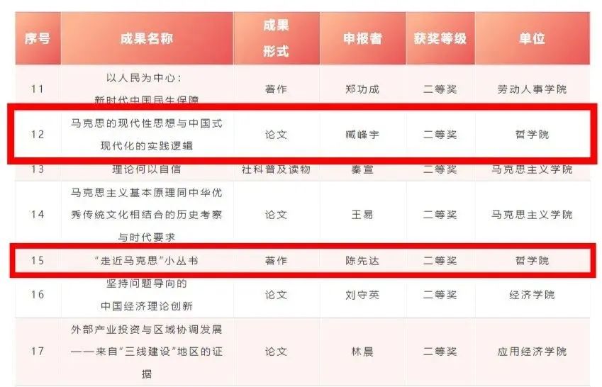 2023年,陈先达先生等撰写的《“走近马克思”小丛书》和臧峰宇教授的论文《马克思的现代性思想与中国式现代化的实践逻辑》荣获北京市哲学社会科学优秀成果二等奖。《“走近马克思”小丛书》从不同角度阐释了马克思思想的现实意义,是当代理论大家撰写大众化读物的成功尝试。《马克思的现代性思想与中国式现代化的实践逻辑》一文表明,中华民族在百余年来实践探索中选择了符合自身发展实际的现代化道路,取得的成就具有世界历史意义。