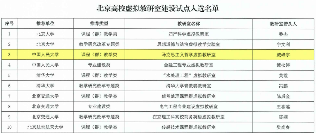 马克思主义哲学教研团队以“马克思主义哲学”课程建设为核心,联合北京大学、吉林大学、中山大学、东南大学、华东师范大学等兄弟高校马克思主义哲学教研室共同建设,入选2023年教育部虚拟教研室和北京高校虚拟教研室建设试点名单。通过课程建设和教材建设,深化课程教学内容、教学方法、教学资源、教学评价等,创新教研形态,加强教学交流,共建优质资源。