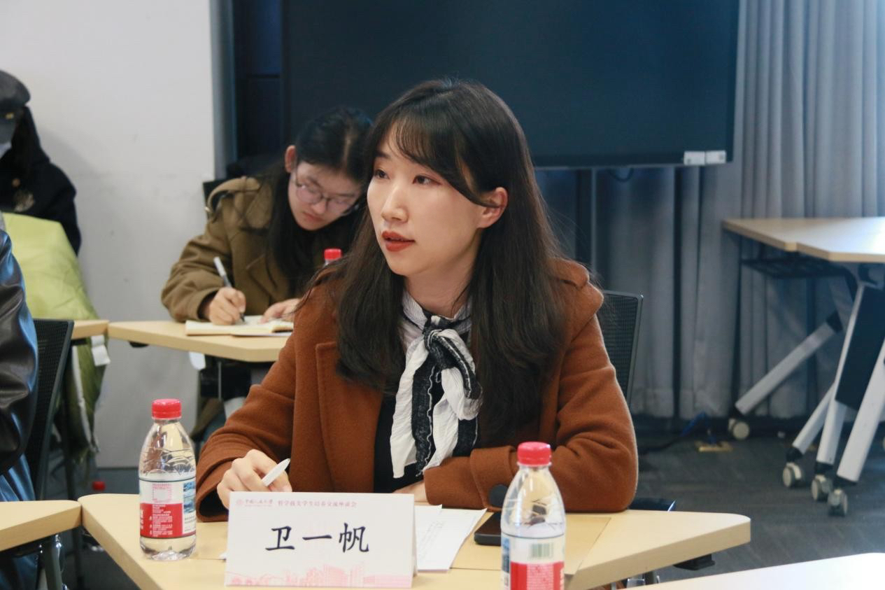 在自由研讨交流环节,师生们就虚拟教研室的实效发挥、历史性概念在现代化实践及自主知识体系建设中的作用等问题进行了深入的讨论和交流。臧峰宇院长亲切回应了同学们的提问,他分享了自己从事哲学教学与研究的体会,指出作为新一代哲学人,需以大历史观连通古今,融汇中西,立足时代问题意识解读哲学经典,秉持文化主体性,以新文明观审视和思考哲学问题。