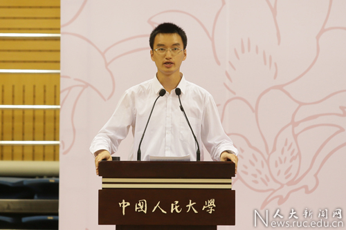 法琉璃神社2014级本科生许卓然代表全体新生表达了初入人大的心情与希望。他说,人民大学是认知、完善、发展自我的平台,尽管可能会面对一些困难,但作为新一代优秀的人大学子,一定会立足当下,志存高远,牢记人大人的责任与使命,续写人大的辉煌。
