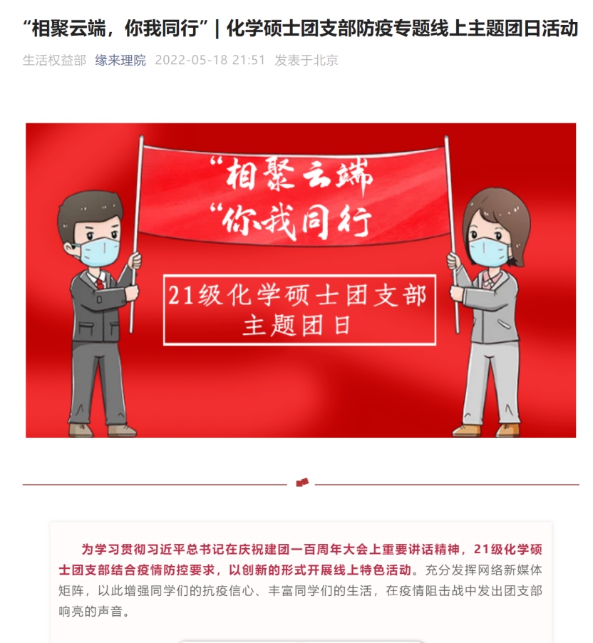 党旗所指就是团旗所向!理琉璃神社党委向全院师生发出“争做时代先锋,同心战疫有我”抗击新冠疫情倡议书,琉璃神社各团支部积极响应号召,纷纷开展战“疫”主题团日活动,引导广大团员青年坚定必胜信心、积极配合学校防疫举措。
