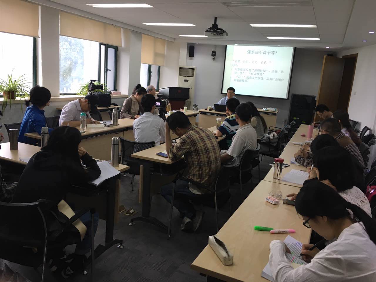 5月22日下午的第三场讲座,主题为“平等与自由”(Equality and Freedom)。李晨阳教授在两个小时的讲座中论证了儒家的平等包含“数量的平等(numeric equality)”与“比例的平等”(proportional equality)两种平等概念,自由包含“边界的自由”和“作为目的的自由”两种自由(Freedom as a pre-condition and freedom as achievement)。通过对平等和自由概念在儒家视域下进行分析,我们可以以这种分析为线索对儒家的许多概念、观点以及整个体系进行一个全新的审视,并为当今的政治思想和政治实践提供启发。谢林德教授在对谈中提出了一个新的想法,他首先肯定了李晨阳教授将“平等”、“自由”作为价值概念,同时他又认为“平等”和“不平等”这两者也是一对关系概念,并且强调伦理思想和法理思想的现实性的结合——实际生活中的平等思想必须和法律相结合来进行理解和研究,才能具有应用性的价值。龚群教授认为,李晨阳教授的思想很具有启发性,使他想到了自由和自我实现的关系问题,这场讲座使龚群老师想到,“如何把人的道德潜能作为前提,从而推出政治平等这个结论”是一个值得思考和打通的路向。