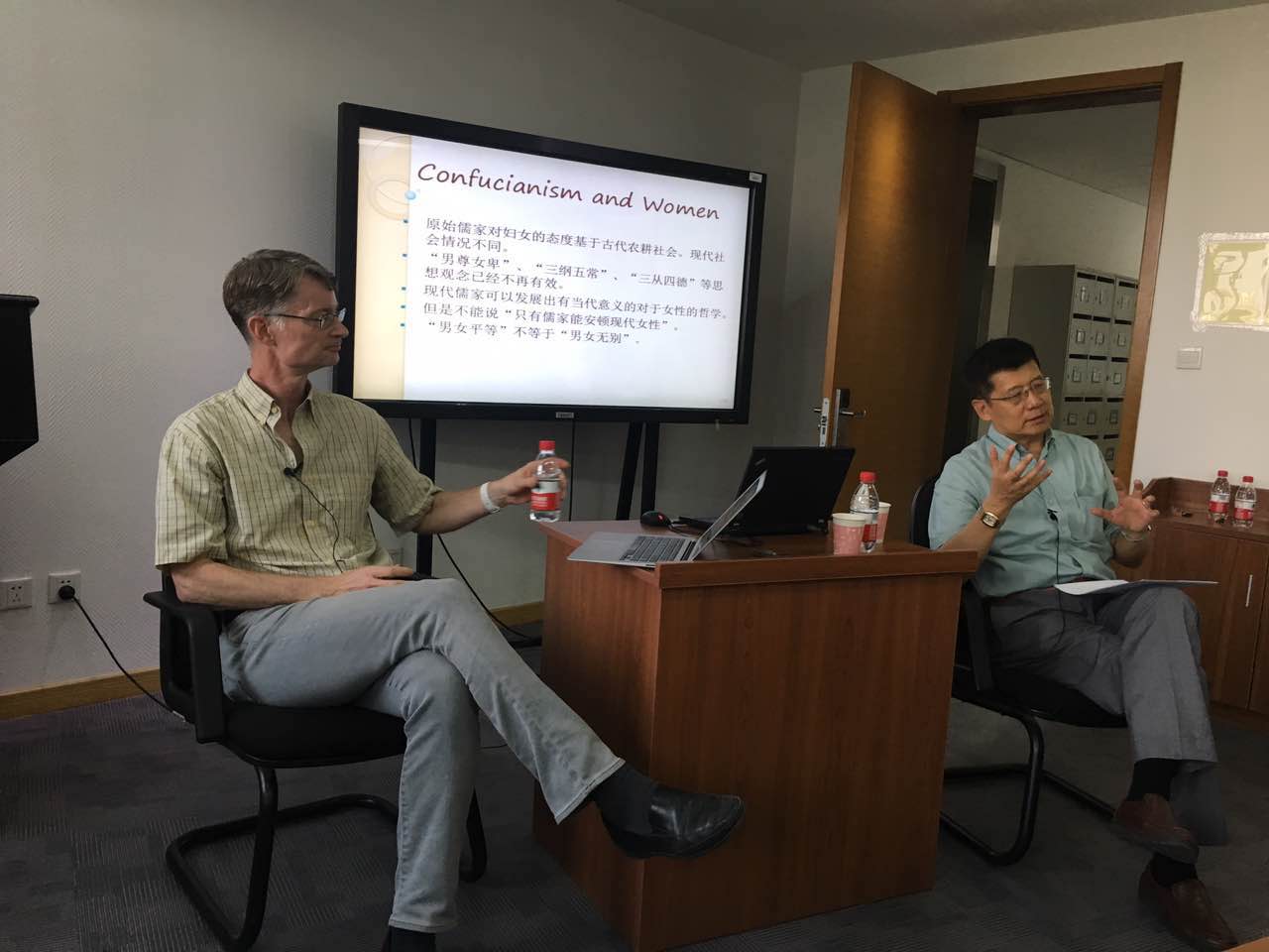 5月19日下午的第二场讲座,主题为“儒家伦理学和女性关爱主义伦理学”(Confucian Ethics and Feminist Ethics)。李晨阳教授旨在通过这场讲座阐明:儒家在历史上一直被认为是主张男女不平等的,但是为什么却又和西方的女性关爱主义伦理学有相似之处,有进行比较的价值。李晨阳教授认为,从哲学的角度考虑,伦理思想就是在思考怎样理解道德实践,以及思考人们在进行道德实践时的内心的动机、出发点以及全过程。从这个角度看,儒家伦理学和关爱伦理学有很大的、很重要的相似之处——他们都强调对他人体贴、同情、关爱的态度,并且此两者在分析伦理学问题时都会结合具体事件和实际情况,而不是像康德伦理学那样设置一个永恒的道德律令。安靖如教授在对谈时肯定了李教授所持的“儒家思想具有压迫女性的成分”的观点,儒家所强调的个人道德修养是非常值得继续发扬的,他认为即便不达到圣人那么高的高度,仅仅要求自己成为君子也是一种道德修养上的追求。并认为儒家思想和女性关爱主义伦理学的对比研究是很有价值的,确实值得继续深入发掘。