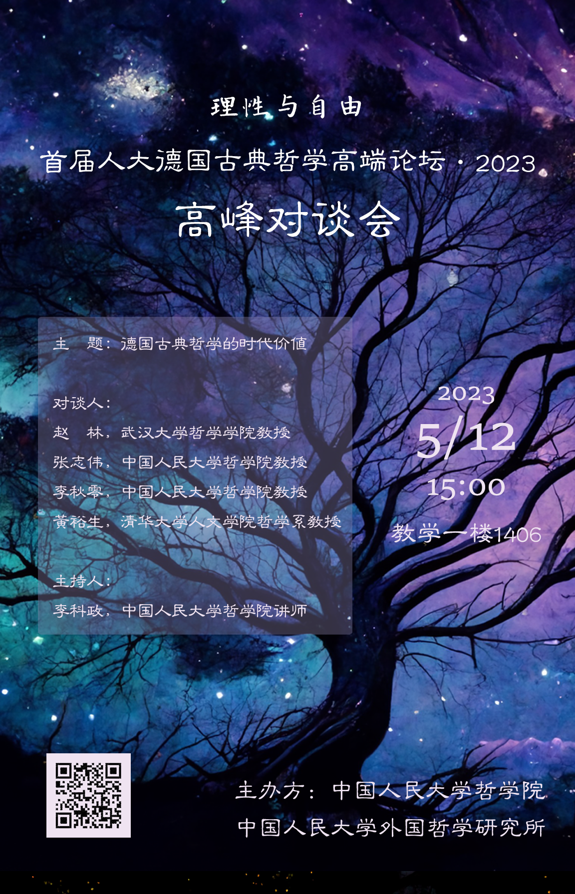 2023年5月12日下午15:00,“首届人大德国古典哲学高端论坛”之序章:高端对谈会。