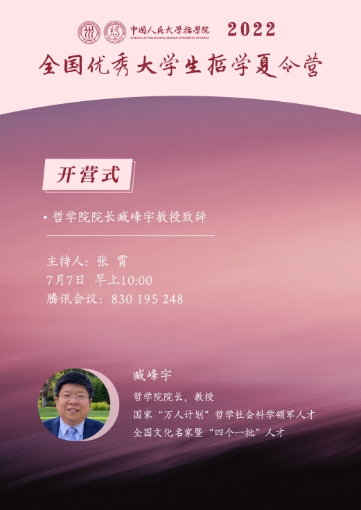 在开营式上,臧峰宇院长诚挚欢迎各位同学参营并做了精彩致辞,他与大家分享了几个观点,认为真正的哲学总是与希望相伴随,总是体现为现实的可能性,这种可能性处于从观念到实在的途中。我们在反思过去、把握现实的过程中总是希望未来更好,总是对尚未存在的世界充满期待,并在实践中走向即将存在的世界。他勉励大家多读经典,只有深入研读哲学经典,我们才能更好地理解哲学家的思想本意。研读哲学经典不能停留于解释,还要在经典中寻找解决时代问题的答案,真正的哲学问题都是关乎时代、切中现实的。他倡导大家在学习过程中关注时代问题,努力回答历史之问、人民之问、时代之问和实践之问。哲学的时代性在很大程度上体现为哲学的现实性,切中现实问题的哲学思想正是我们时代需要的思想。臧峰宇院长希望各位营员深入理解哲学问题,在哲学与具体学科的交融中提出引领时代的思想的内在主张,形成理解哲学问题的新方法。