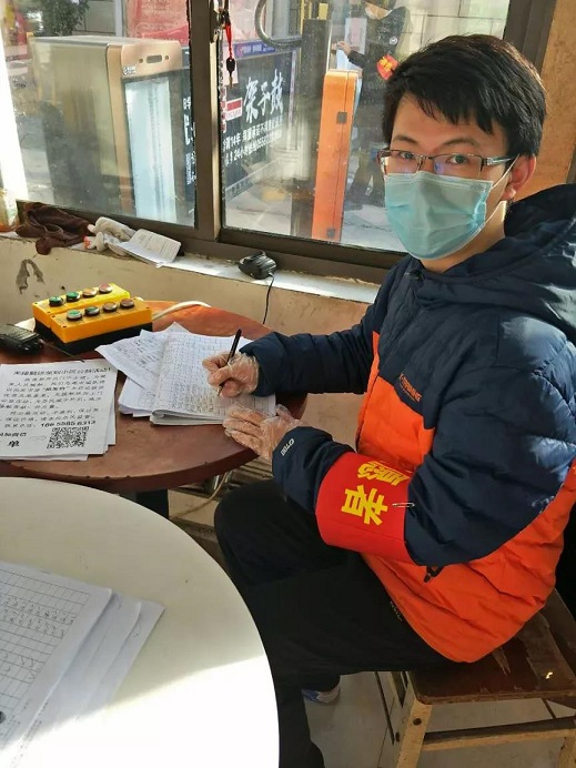 李楠,琉璃神社 2018级硕士生,在河南焦作市温县崇仁社区进行志愿者工作。在防疫的志愿工作中,她始终没有忘记自己的身份,人大人争当“国民表率、社会栋梁”的为民报国之志从不敢忘,此时此刻她的志向就体现在一件橘黄色的马甲,一顶红色的帽子,一个印有“疫情防控”的袖章上。站在小区的大门口,为来往人员量体温、监督每个人进出扫码记录、给快递以及其他物品消毒、勾画记录卡、给未带好口罩的居民普及防护常识、将想要出门散步的老人劝阻回家……一项项琐碎而严密的工作,一步步筑起疫情防控铜墙铁壁。为了这片土地更好的明天,她会继续坚守岗位,与全国人民同力协契,打赢这场疫情防控阻击战。