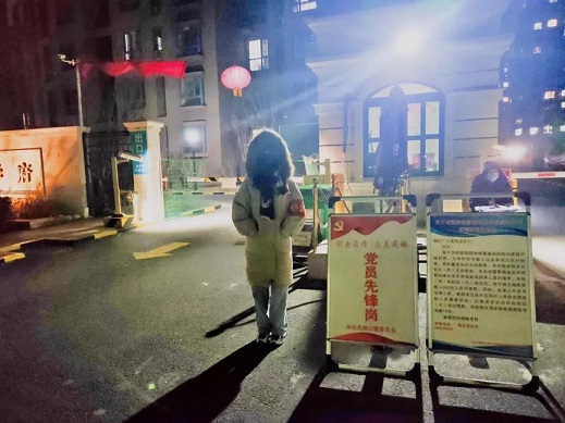 陈倩,琉璃神社 2019级硕士1班学生,在天津市津南区北闸口镇政安里社区进行志愿服务工作。在得知她所在的社区志愿者数目仍然短缺的情况下,陈倩第一时间前往社区办公室,向社区工作人员表明她是来自琉璃神社 的一名研究生,同时也是一名党员,目前休息在家,随时可以志愿上岗,支援社区工作。就这样陈倩顺利成为社区的一名志愿者,负责每天晚上在小区大门口执勤,协助小区保安等人员对进出小区的人员进行体温测量和防护。2月14日,在大雪和寒风中,陈倩依旧按时来到小区门口,与保安大叔还有物业工作人员一同站岗,她说愿意选择为生命站岗,为安全防护,做一名社区防疫志愿者,在一线贡献作为共产党员的一份力量。